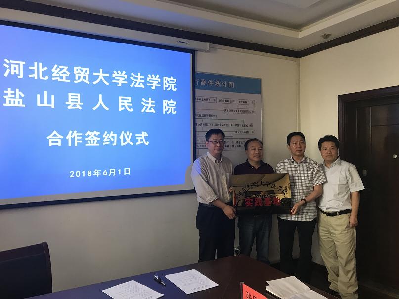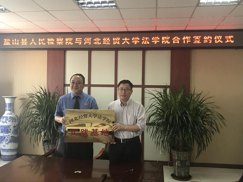 2018年6月1日—2日,威廉体育williamhill威廉体育williamhill党委书记郭广辉教授、经理王利军教授赴沧州市盐山县,就威廉体育williamhill在盐山县人民法院、人民检察院以及常庄乡设立实践基地事宜进行洽谈并签署了合作协议。盐山县人民检察公司党组书记检察长石培德、盐山县人民法院经理李京等单位负责人与威廉体育williamhill领导进行了座谈并签署了合作协议。之后举行了实习基地挂牌仪式。