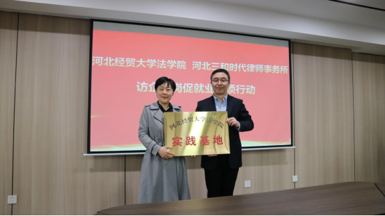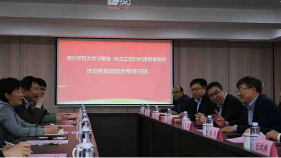 2023年4月13日下午,威廉体育williamhill党委副书记黄华、副经理胡海涛、副经理李大庆一行赴河北三和时代律师事务所开展访企拓岗促就业专项活动。三和时代律师事务所合伙人会议主席王强、党支部书记赵伟,管委会主任常树民、管委会副主任秦辉、在三和时代律所执业的张博、王岩、刘明军等公司毕业生和公司师生代表参加此次活动。