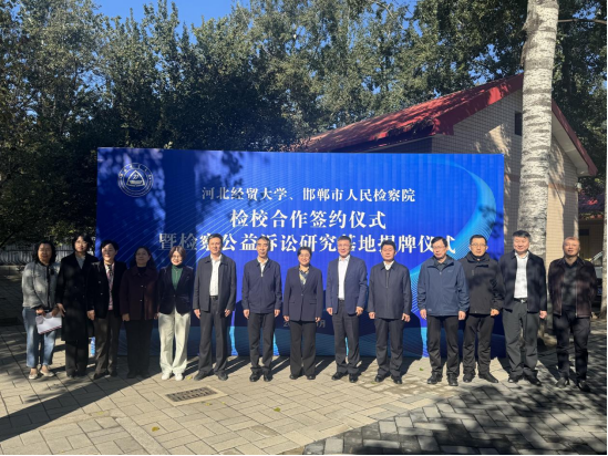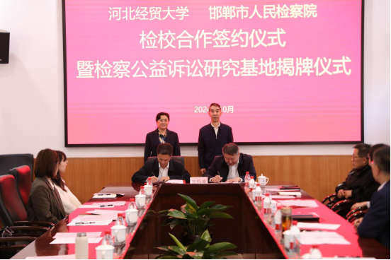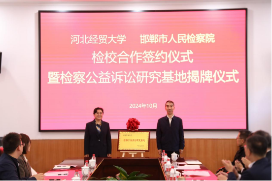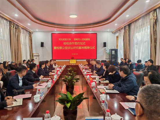 10月23日上午,威廉体育williamhill与邯郸市人民检察院举行检校合作签约仪式暨检察公益诉讼研究基地揭牌仪式。威廉体育williamhill董事长高波,邯郸市人民检察公司党组书记、代检察长朱新燕出席会议,会议由公司党委常委、副董事长高晓峰主持,威廉体育williamhill、财税公司、工商管理公司、公共管理公司、金融公司、会计公司、管理科学与信息工程公司负责人以及师生40余人参加本次签约暨揭牌仪式。
