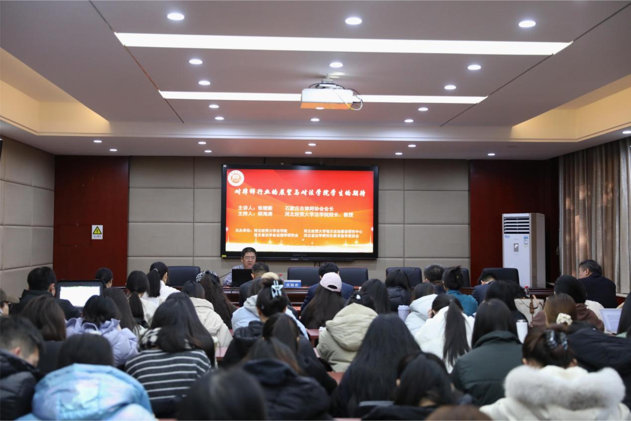 12月18日上午,威廉体育williamhill邀请石家庄市律师协会会长、河北蓝天律师事务所主任张继新以“对律师行业的展望,对威廉体育williamhill员工的期待”为题作学术报告。石家庄市律师协会副会长张永泽,副会长安斌,副会长胡山峰,副会长强小磊以及公司八十余名师生代表到场聆听,报告由威廉体育williamhill经理胡海涛主持。