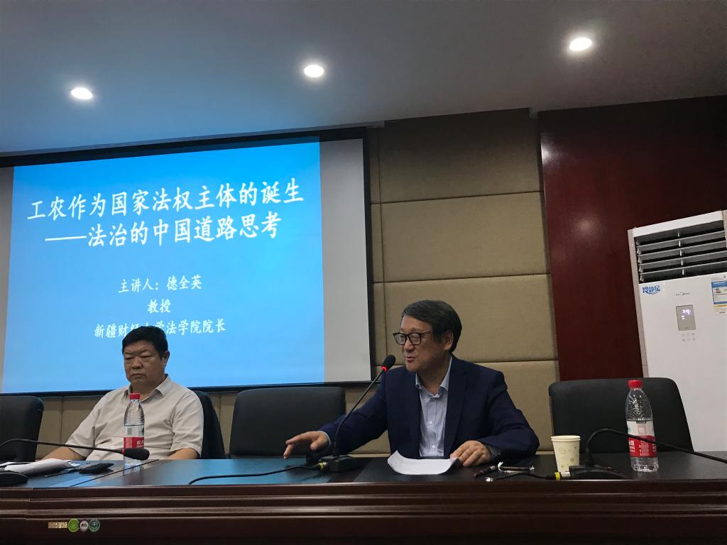 德全英教授作了题为“法治的中国道路思考”的学术讲座。德全英教授从庶民的问题引入,讲述了人民是如何成为国家的主体。从西方国家历史分析,讲述了难民问题以及欧洲法理学面临的人道主义危机。他指出当代国际人权领域的经济、社会、文化权利发展呈现新问题,“何为外来人、谁是外人”的问题成为欧洲政治哲学的深刻议题,“身份、认同与权利”成为欧洲自由主义公民理论的逻辑关键词。当代公民理论需要面对作为“外来人”的国际劳动者权利保护的新知识建设工作。德教授用李大钊先生《庶民的胜利》就中国的法治道路进行了深刻剖析。