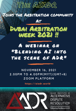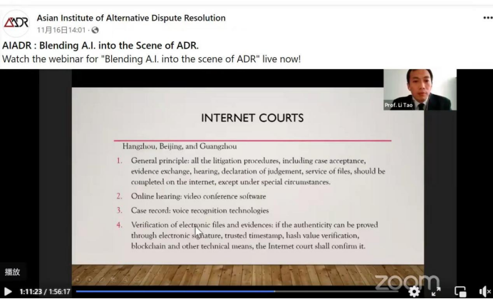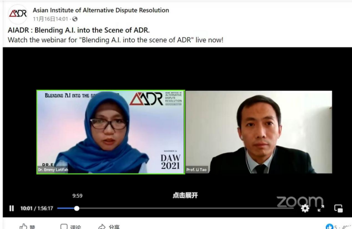 11月16日下午两点,威廉体育williamhill李涛教授受国际组织——亚洲多元争议解决研究院(AIADR)的邀请参加由迪拜仲裁社区,迪拜国际金融中心仲裁协会(DIFC-LCIA)组织的2021迪拜仲裁周的主题研讨会。研讨会通过zoom会议的形式进行,主题为“将人工智能融入到多元争议解决的场景”。