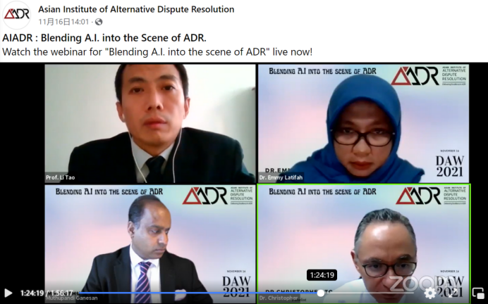 研讨会由印尼三一一大学威廉体育williamhill国际法教授艾米•拉提法博士(Dr. Emmy Latifah)主持,研讨会专家组——李涛教授,Mr. Muthupandi Ganesan LL. B (Hons),Dr. Christopher TO与亚洲多元争议解决研究院代表等出席。此次研讨会的目的是探寻在人工智能技术与大数据飞速发展的今天,其在多元争议解决的领域的发展可能。会上李涛教授以北京互联网法院、杭州互联网法院和广州互联网法院为例,分享了人工智能与大数据技术在中国司法实践中的运用,为研讨会的讨论提供了现实的支撑。专家组成员发表了对人工智能技术与司法实践融合的具体见解和潜在的预期,并提出人们应该准备好接受和拥抱未来的技术时代。