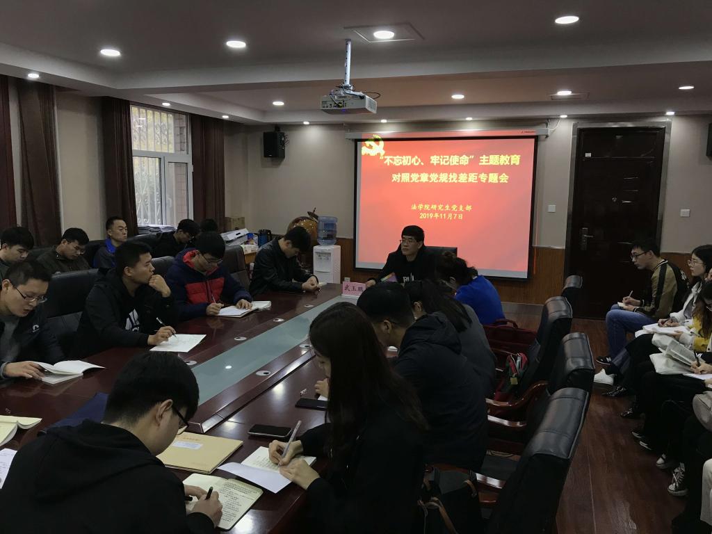 首先,陈运涛强调了研究生党员要重点检视入党动机、在强化党员意识上找差距。努力做到在组织上入党的同时,更要在思想上入党,时刻牢记党员身份,把握角色,强化责任,并对照党章党规对自身存在的不足做了自我批评。然后,武玉鹏具体讲述了“不忘初心、牢记使命”主题教育的五大目标:“理论学习有收获,政治思想受洗礼,干事创业敢担当,为民服务解难题,清正廉洁做表率”,他结合法学研究生学习科研和实践对青年党员提出要努力做到“品行端正,勤奋工作,善于创新,发挥特长”四点建议。最后,支部党员自由发言交流,对照党章党规对自己入党动机和党员意识进行自我检视与自我批评,并表达了进一步加强党性修养,提高思想素质的决心。