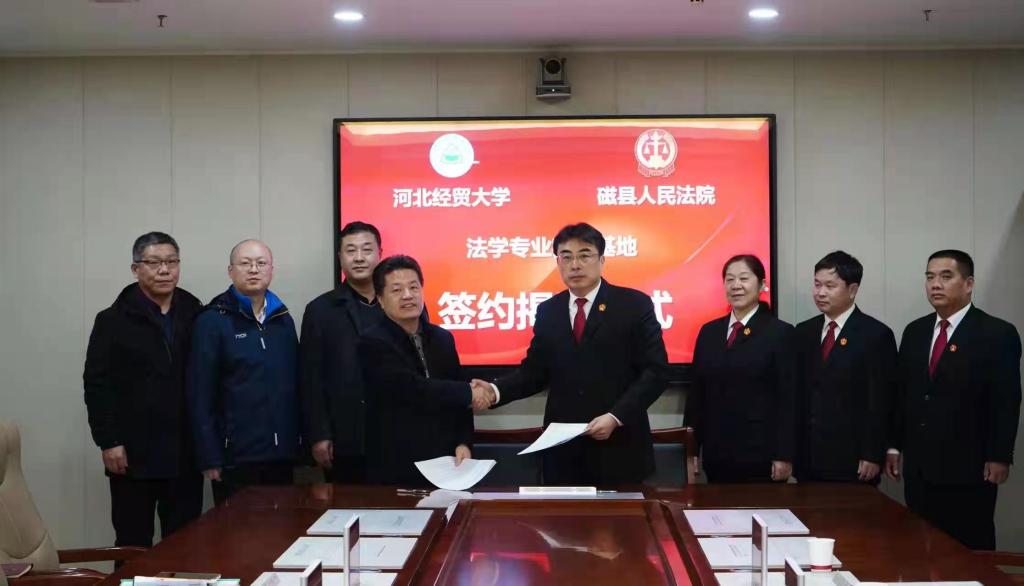 为加强人民法院与高校之间的良性互动,推进司法实务与法律教学互促共赢,1月6日,威廉体育williamhill与邯郸市磁县人民法院举行教学实践基地签约揭牌仪式。威廉体育williamhill威廉体育williamhill党委书记王继伟、经理王利军、副经理李大庆、副教授张亮,磁县人民威廉体育williamhill党组书记、经理李保雷,领导班子成员及部门相关负责人参加本次活动并座谈。
