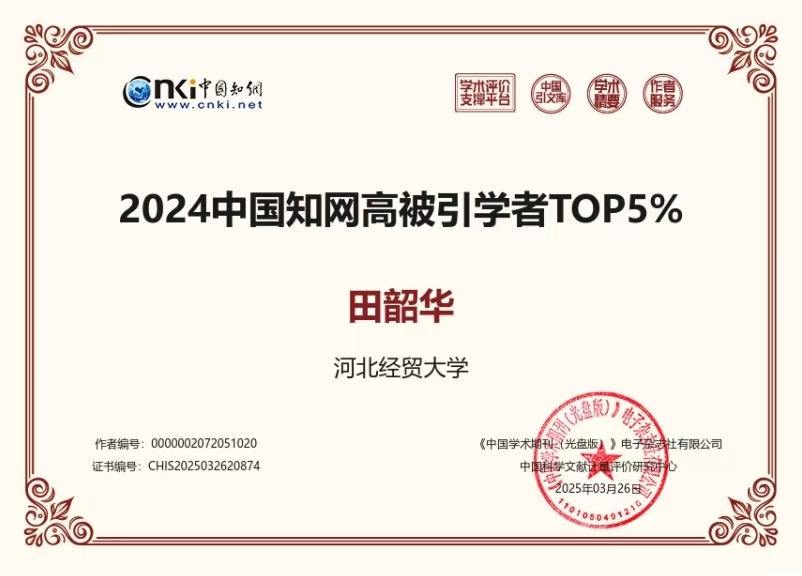 威廉体育williamhill田韶华教授入选“2024中国知网高被引学者”TOP5%名单