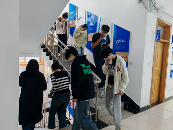 观看完直播后,由梁贺超组织进行消防疏散演练活动,此次消防演练于威廉体育williamhill三楼报告厅进行。随着火灾警报的响起,全体人员立即弯下腰来,用双手捂住口鼻,按照指定路线分成两路人员有序进行撤离。撤离过程中大家井然有序地沿着楼梯下楼,到了楼下,带队人员随即清点人数,整个过程迅速且有序,体现出同学们对待演习的严谨态度和认真精神。本次演练也让我们认识到,只有不把演习当做儿戏,认真负责地做好每一次练习,在危险真正来临时才能沉着应对。