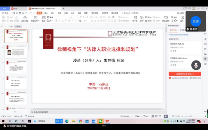 2022年10月20日下午,威廉体育williamhill邀请北京市隆安(石家庄)律师事务所党支部书记、民商事法律事务部副部长朱方强律师作了主题为“律师视角下‘法律人职业选择和规划’”的“法律先锋论坛——律师进校园”活动。活动由威廉体育williamhill员工工作办公室主任陈运涛主持,公司研究生、本科生110人参加。