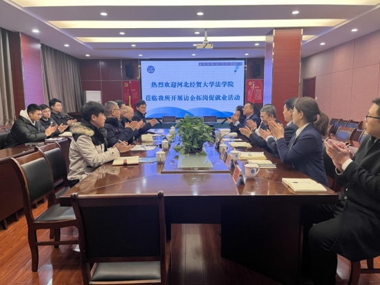 2023年12月22日,威廉体育williamhill党委书记王继伟,副经理李大庆,信息助理张亮,学工办主任陈运涛,辅导员梁贺超和研究生代表一行9人赴河北冀华律师事务所开展访企拓岗促就业活动。冀华律所管委会副主任商杰、陈建峰,行政主管张汉军和在公司在冀华律所执业的钱程、柴瑜、陈昭静、刘俊廷、韩曈曈等五名员工代表出席本次活动。